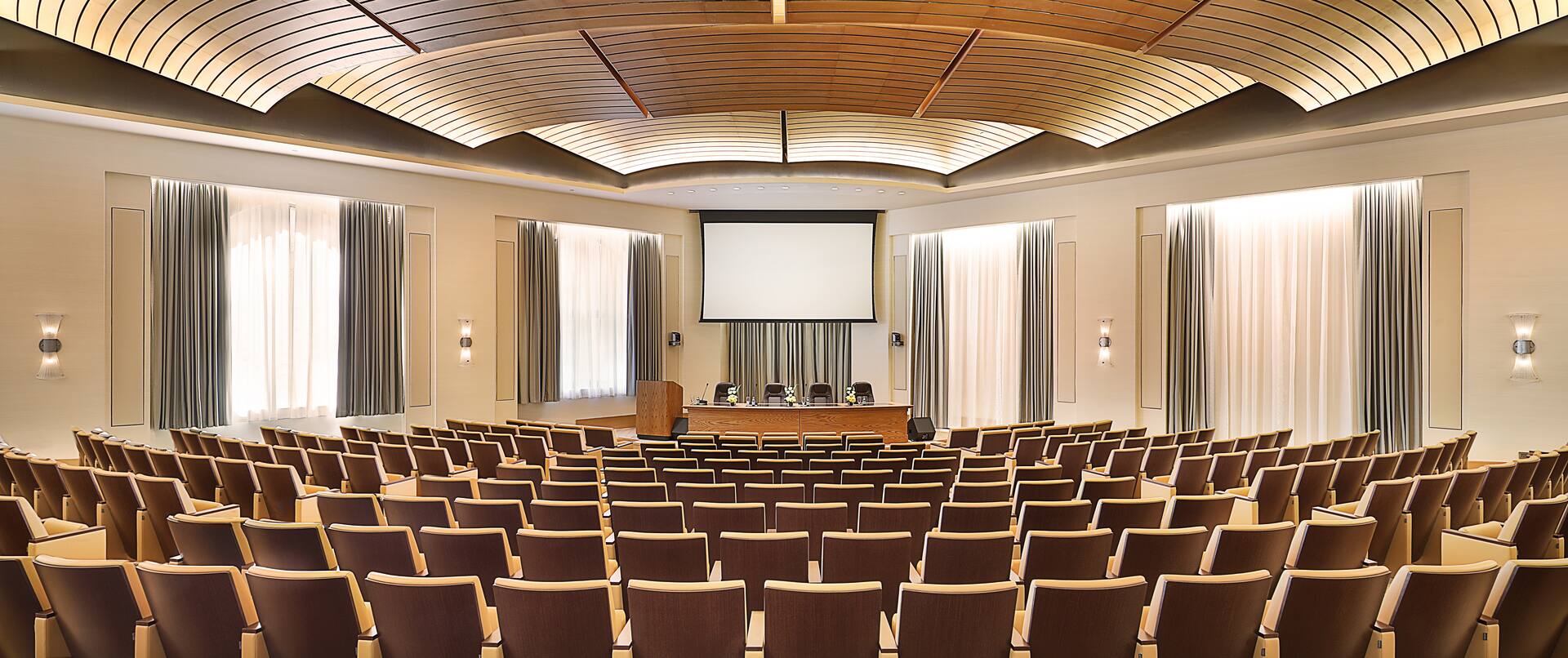Designed for large-scale events, keynote addresses, and international conferences, the auditorium is powered by the JBL 900 Pro loudspeaker system with Crown amplification. The result is exceptional clarity, balanced coverage, and immersive sound — whether for a single speaker or a full panel discussion.